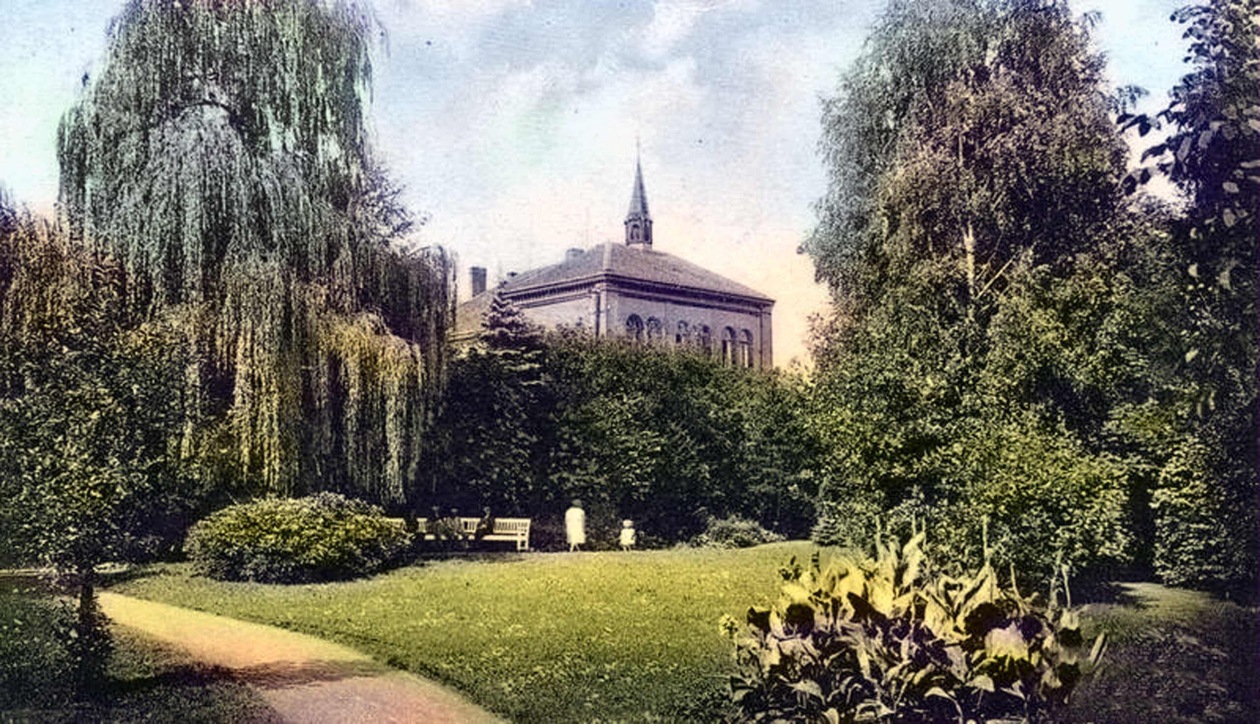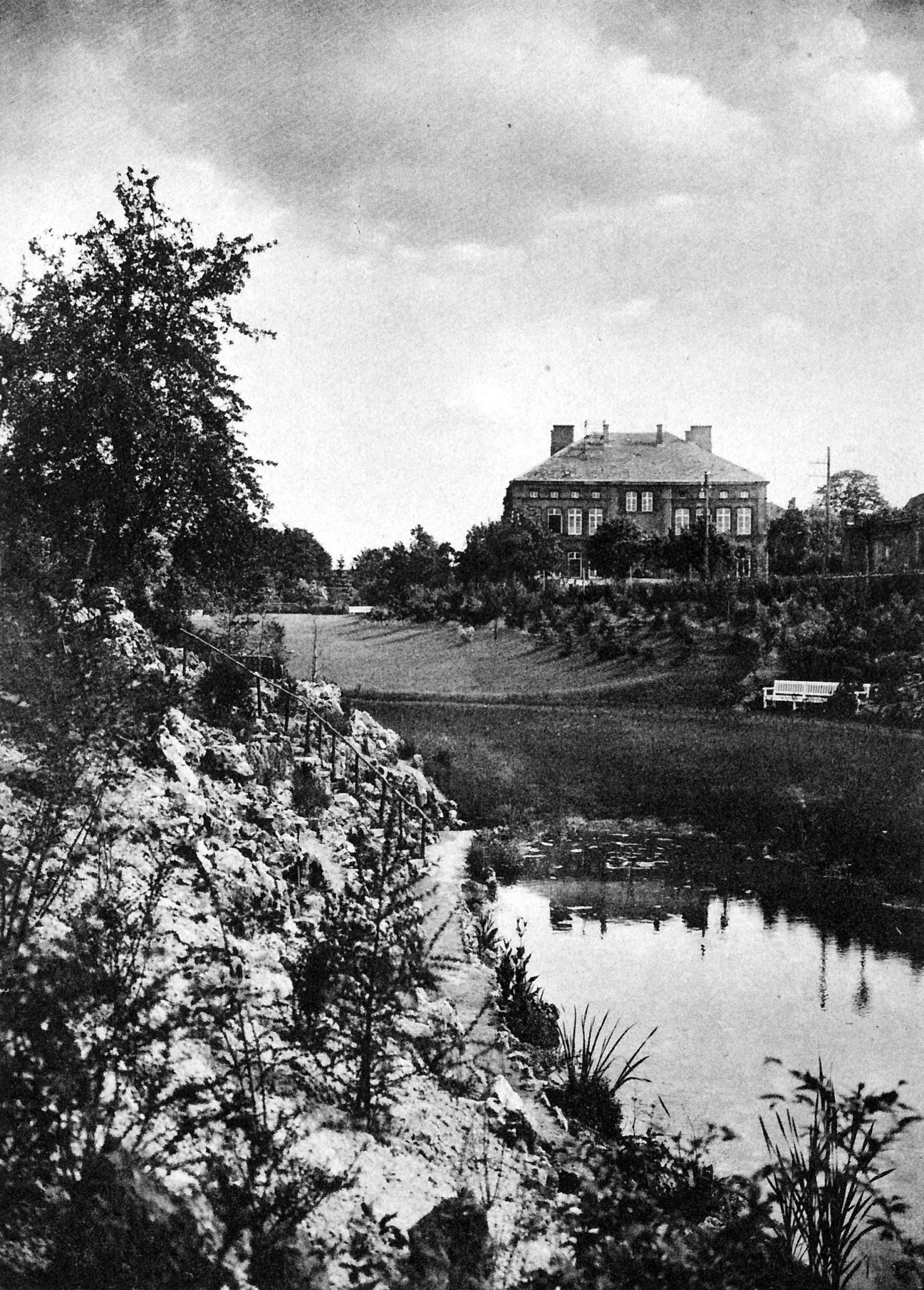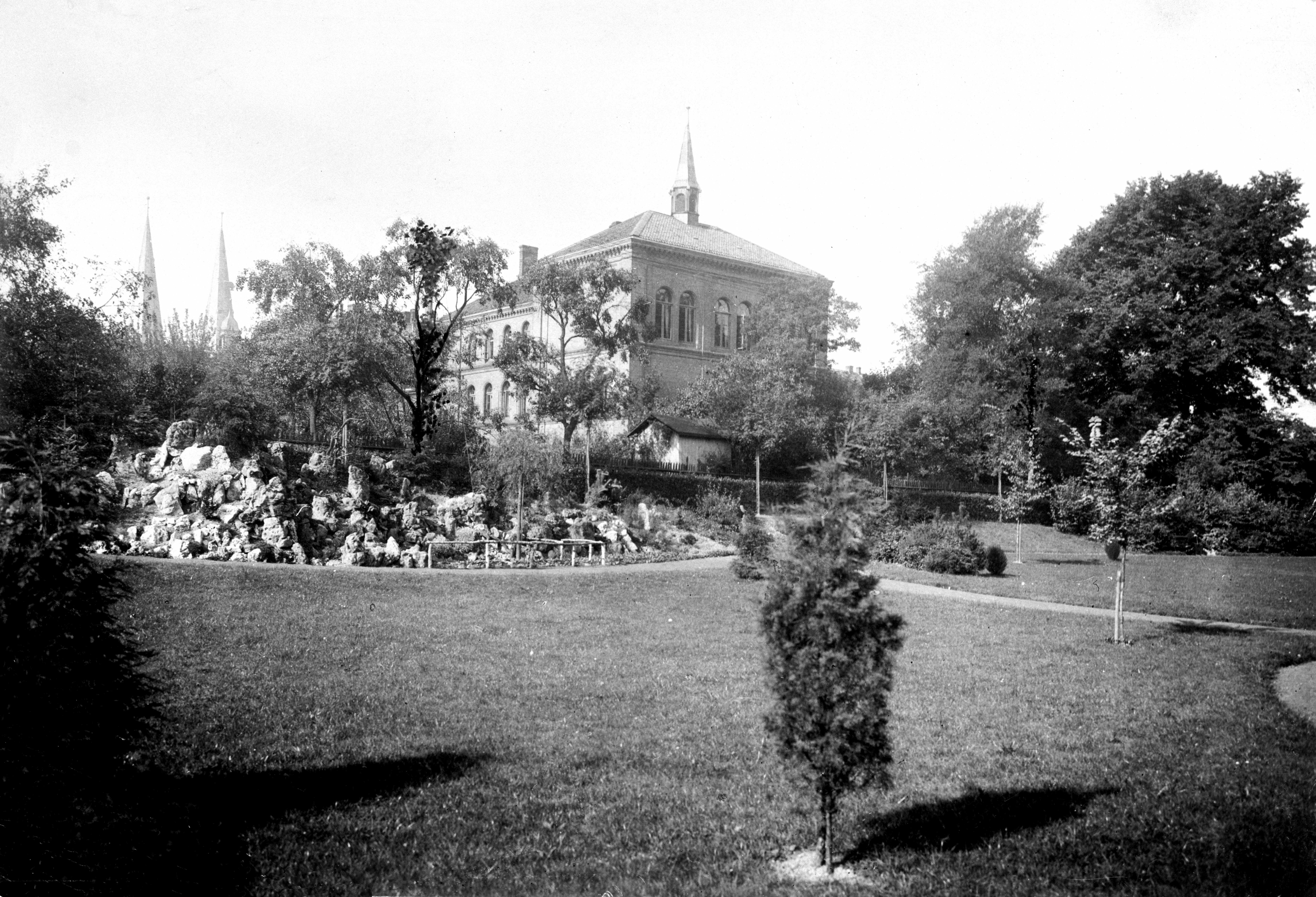 Von den Oberen Anlagen fällt der Blick auf den östlichen Teil des Lehrerseminars. Es wird von einem Dachreiter gekrönt. Die hohen Fenster deuten auf die Aula hin. Am Wall steht ein kleines Gebäude. Auffallend ist der junge Bewuchs der kurz vor dem Ersten Weltkrieg begonnenen Anlagenumgestaltung. Am Fuß des Walles erkennt man einen Steingarten.