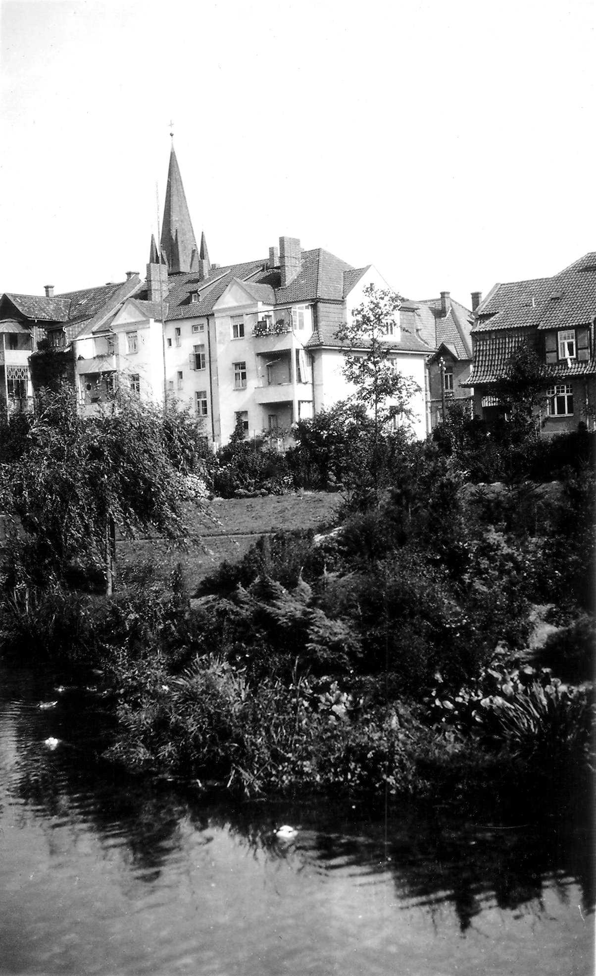 Die Seminar-Anlagen waren ein verhältnismäßig bescheidener Anfang. Damals stand noch die „Alte Brauerei“. Das Warnewasser stürzte sich noch über den Überfall donnernd in die Tiefe des Wallgrabens, an den sich zur Bismarckstraße hin der „Rektor-Garten“ anschloss“.