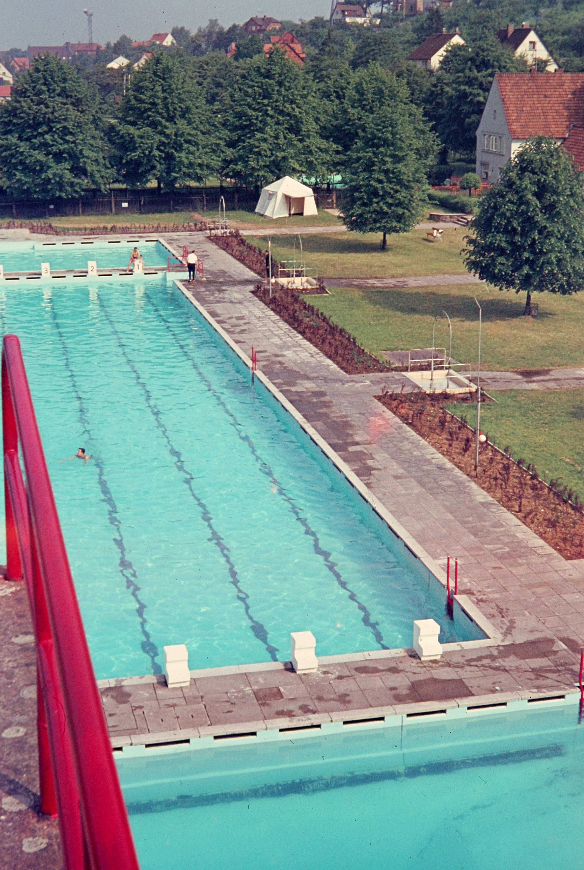 1960er Jahre, aus Blickrichtung Stadion bzw. Liegewiese. Der Steinberg im Hintergrund noch nahezu unbebaut. |