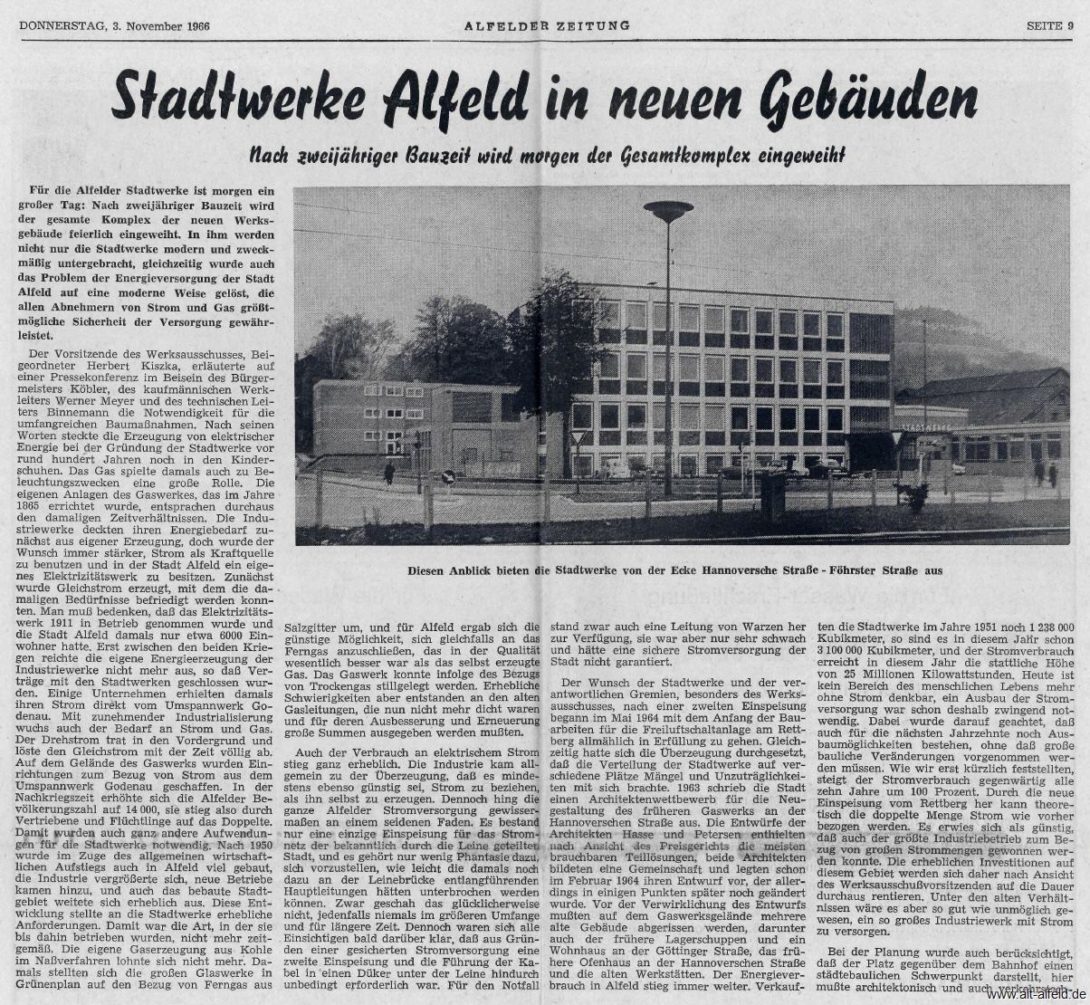 Zu diesen Bild schrieb die Alfelder Zeitung: Blick auf einen Teil der neuen Gebäude der Stadtwerke von der Föhrster Straße aus. Rechts das Betriebsgebäude, in dem auch die Verwaltung untergebracht ist, dahinter die Schaltstation, und das Fünffamilienwohnhaus und der alte Gasometer.