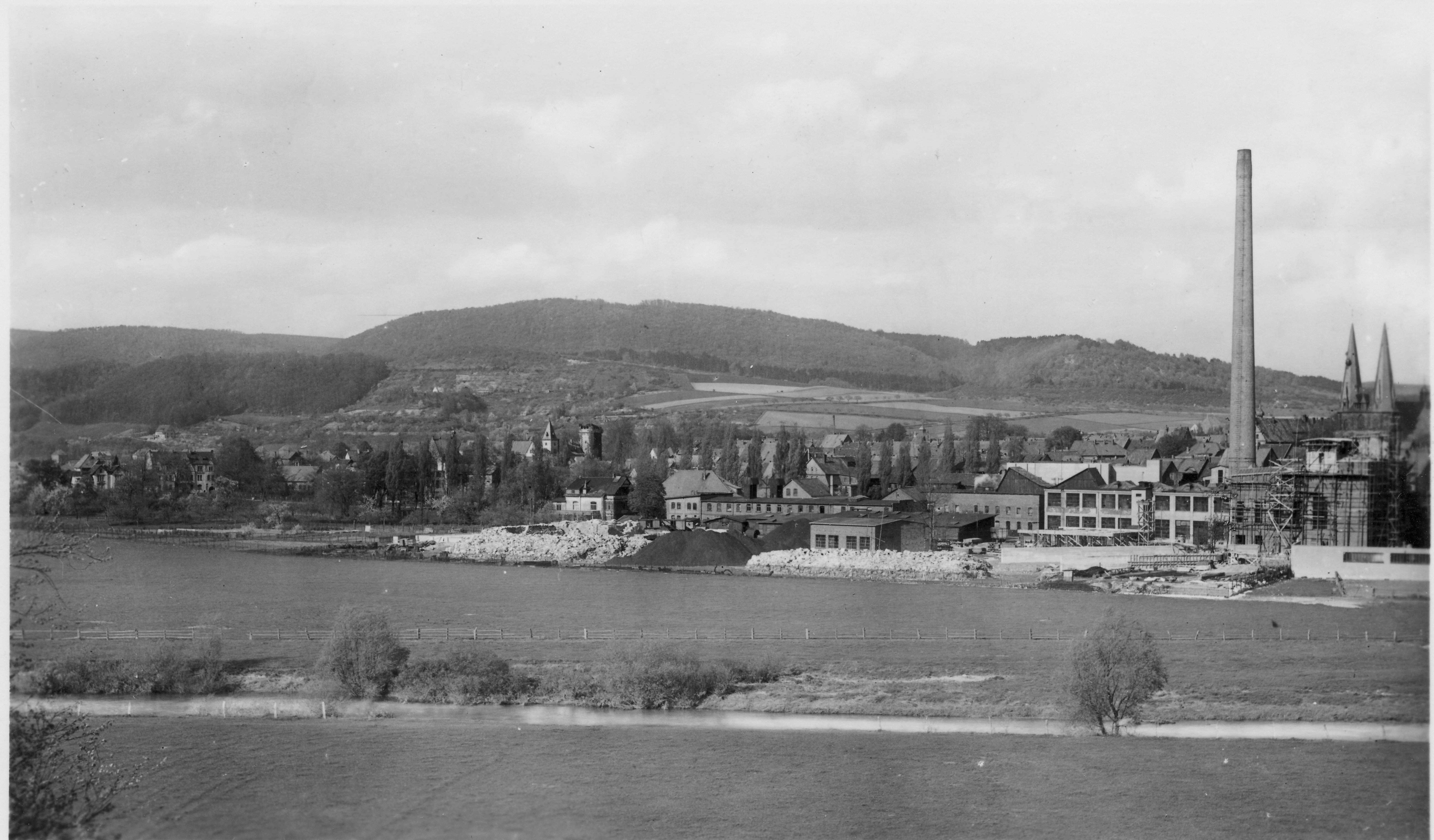 Auf der linken Seite des Bildes sehen wir den Ostteil des Zellstoffwerkes (auch Zellulose genannt). Gut zu erkennen ist der alte Schwefelturm, an dem unter freiem Himmel Wasser abtropfte, um sich mit Schwefelgasen zu vermischen.