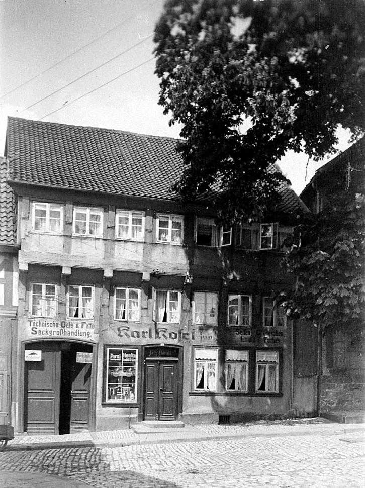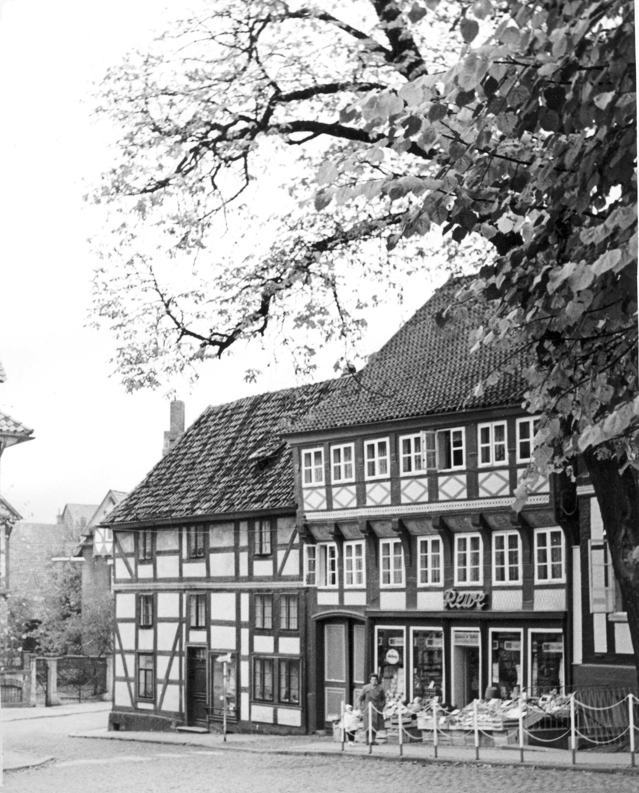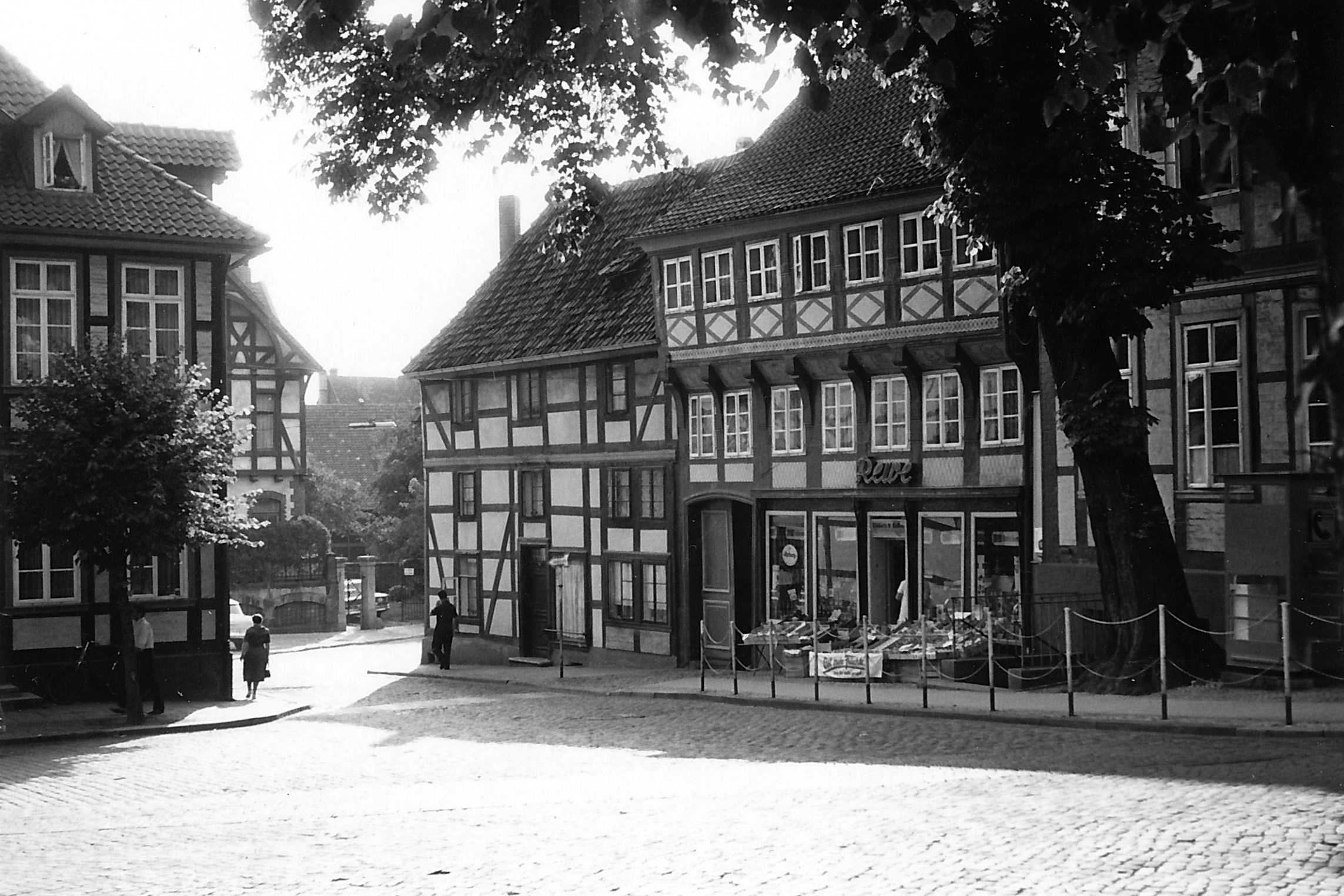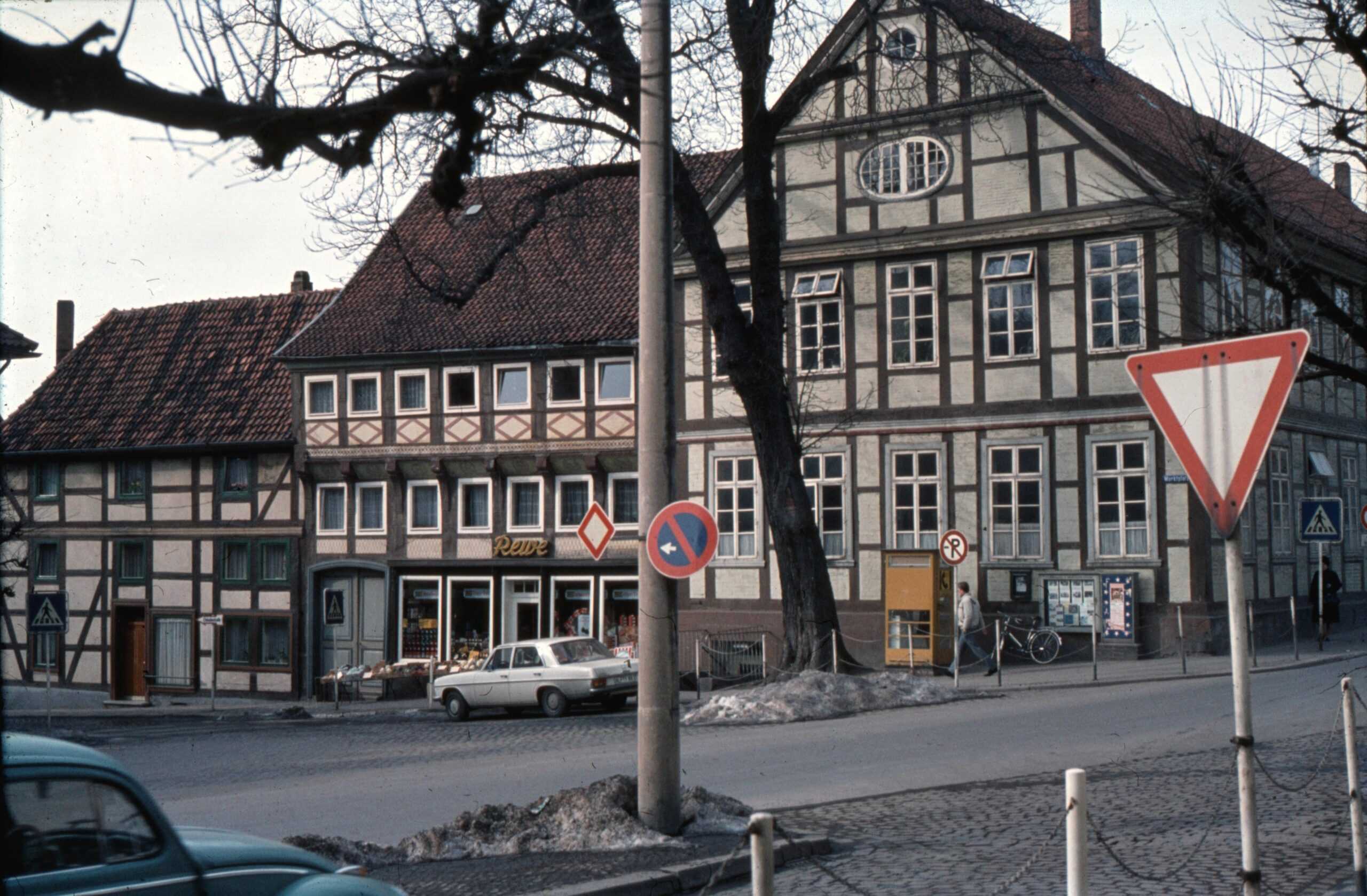 Links neben dem Haus grenzt die Gemüsehandlung „Gemke“, sowie das Haus des ehemaligen Alfelder Seilermeister an. Beide Häuser lagen am Übergang vom Markt zur Perkstraße. Wie an verschiedenen Stellen der Stadt auch, trennte eine Kettenabsperrung die Fußgänger vom damaligen Verkehr des Marktplatzes.