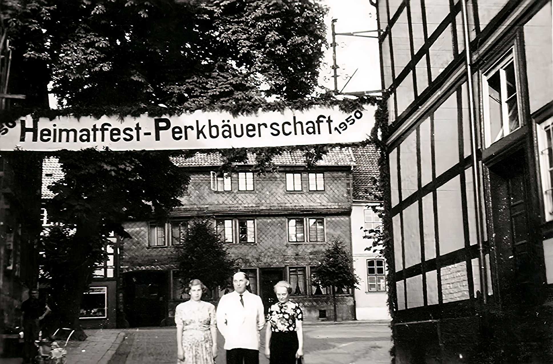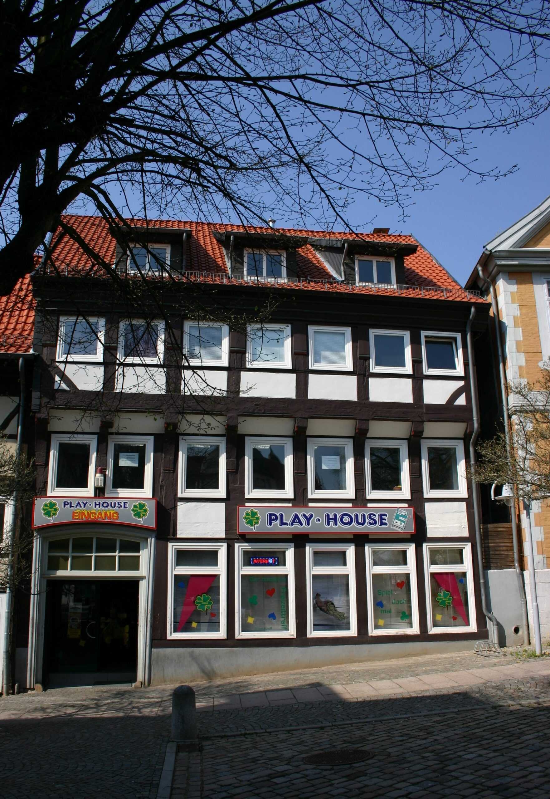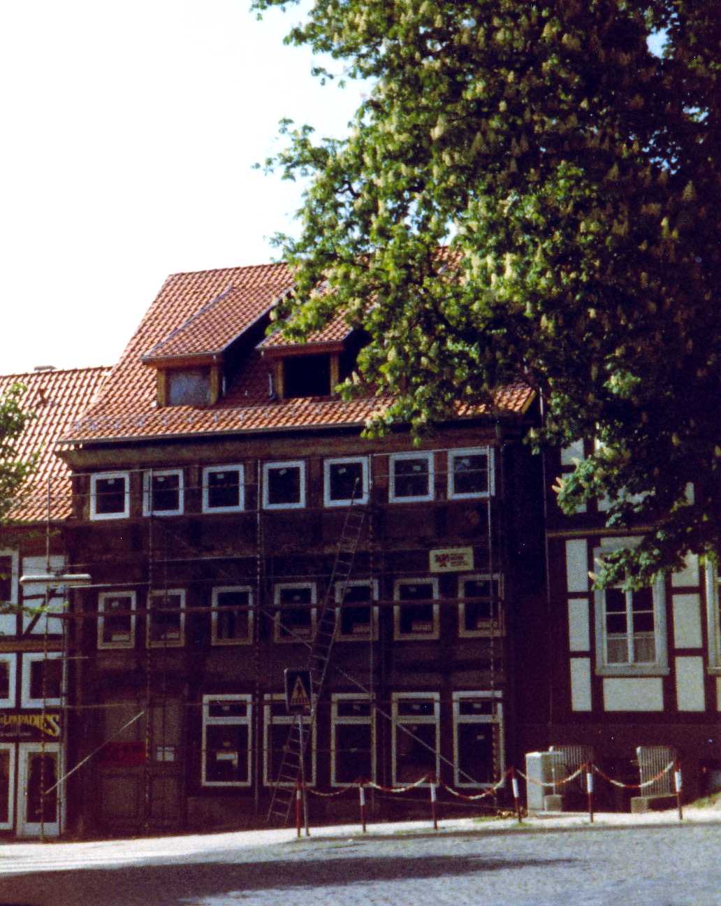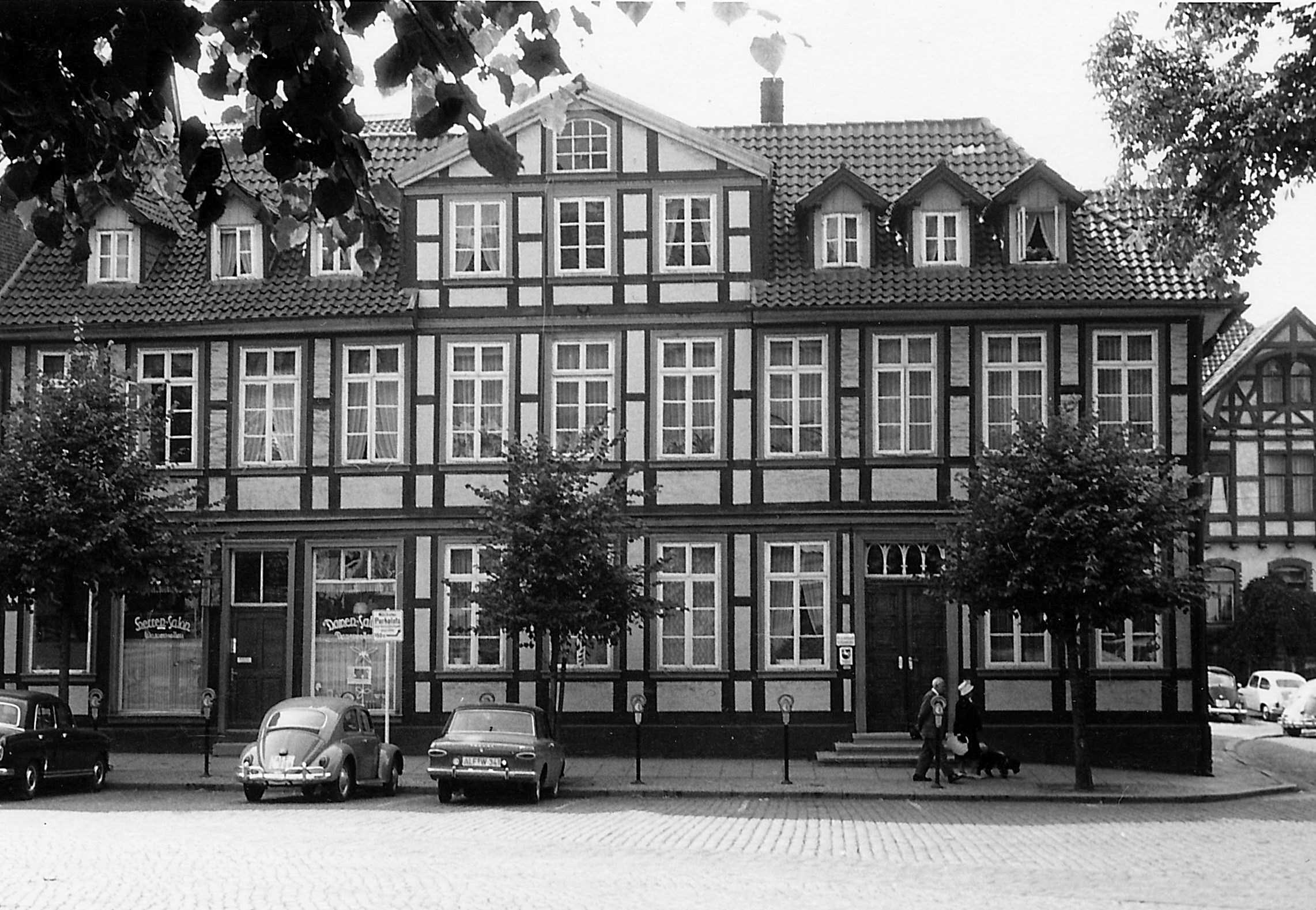 Links neben dem Haus grenzt die Gemüsehandlung „Gemke“, sowie das Haus des ehemaligen Alfelder Seilermeister an. Beide Häuser lagen am Übergang vom Markt zur Perkstraße. Wie an verschiedenen Stellen der Stadt auch, trennte eine Kettenabsperrung die Fußgänger vom damaligen Verkehr des Marktplatzes.