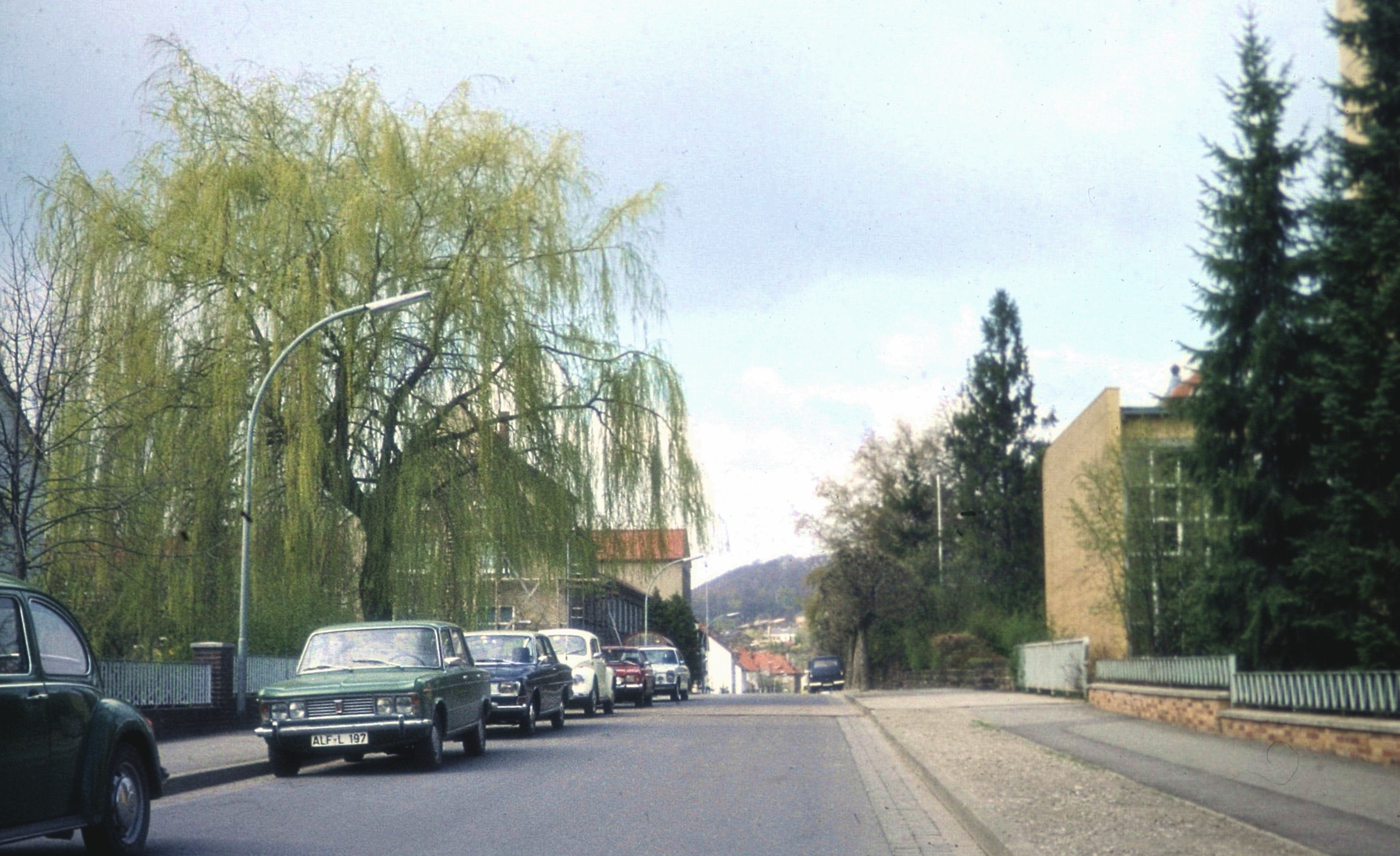 Die ehemalige Wiese hinter der Hecke ist heute der dazugehörige Sportplatz der Schulrat-Habermalz-Schule. Die Vergleichsaufnahme zeigt wieder einmal sehr deutlich den strukturellen Wandel über die letzten Jahrzehnte.