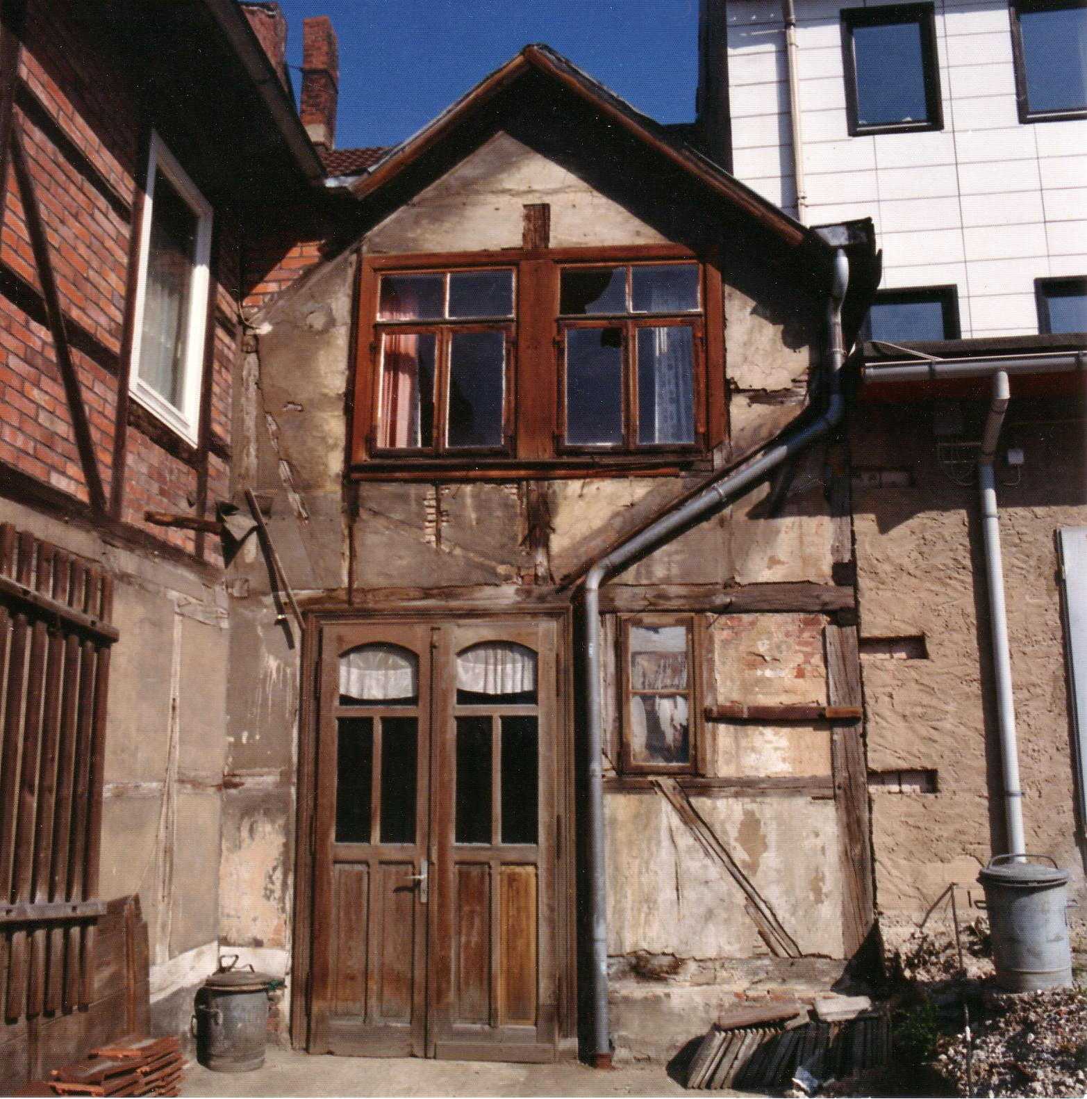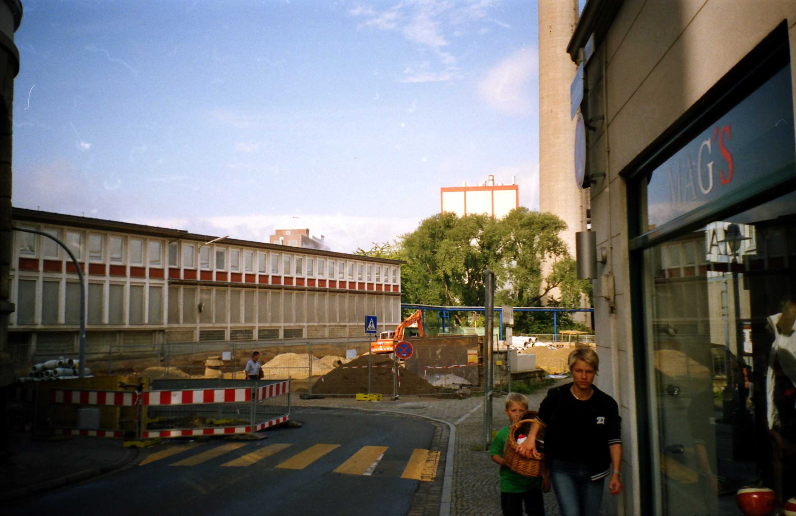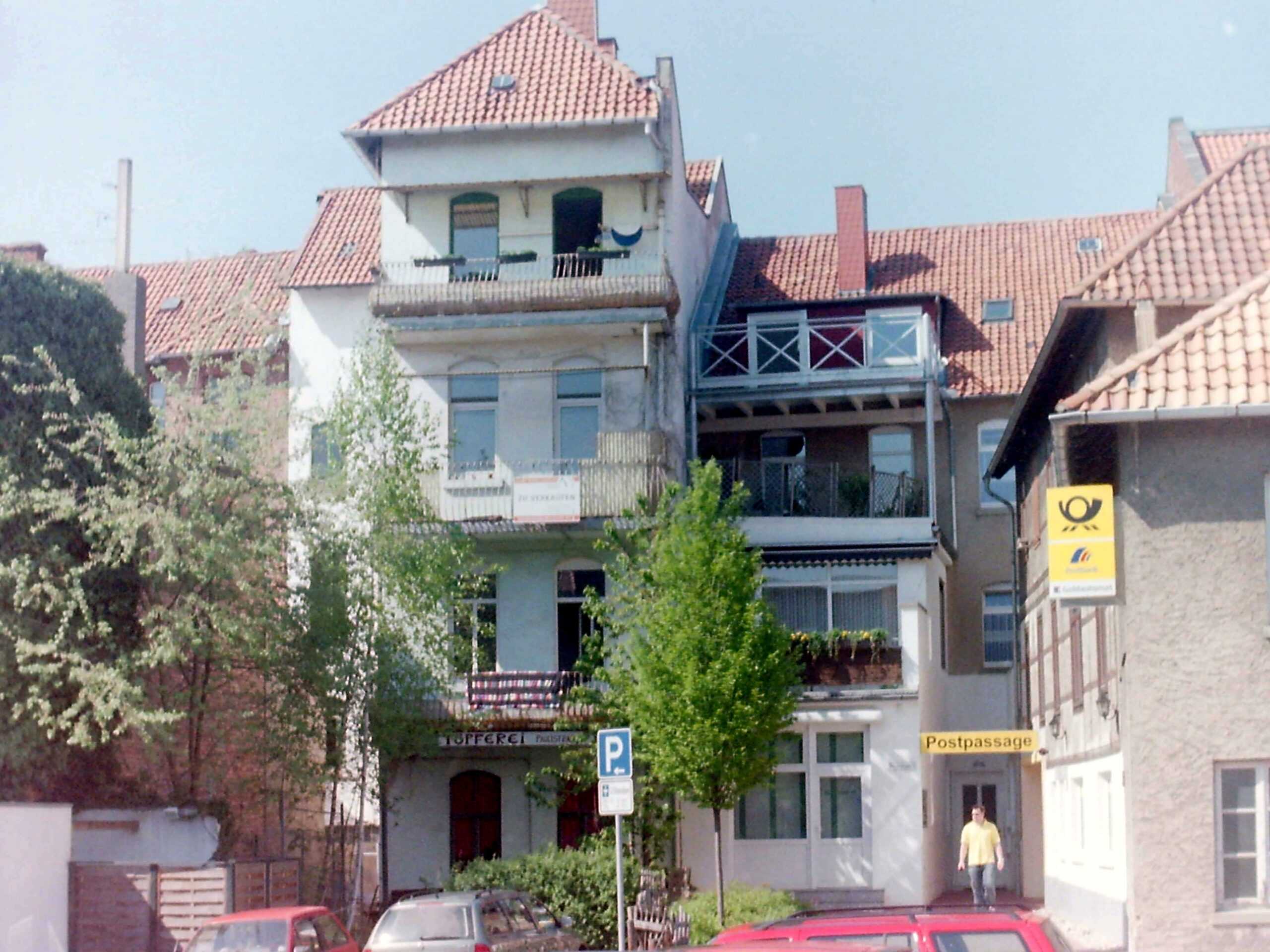 Wir sehen die rückwärtige (Südwall) Ansicht des Geschäftes während der Umbauarbeiten zur heutigen Postfiliale im Jahr 2000.