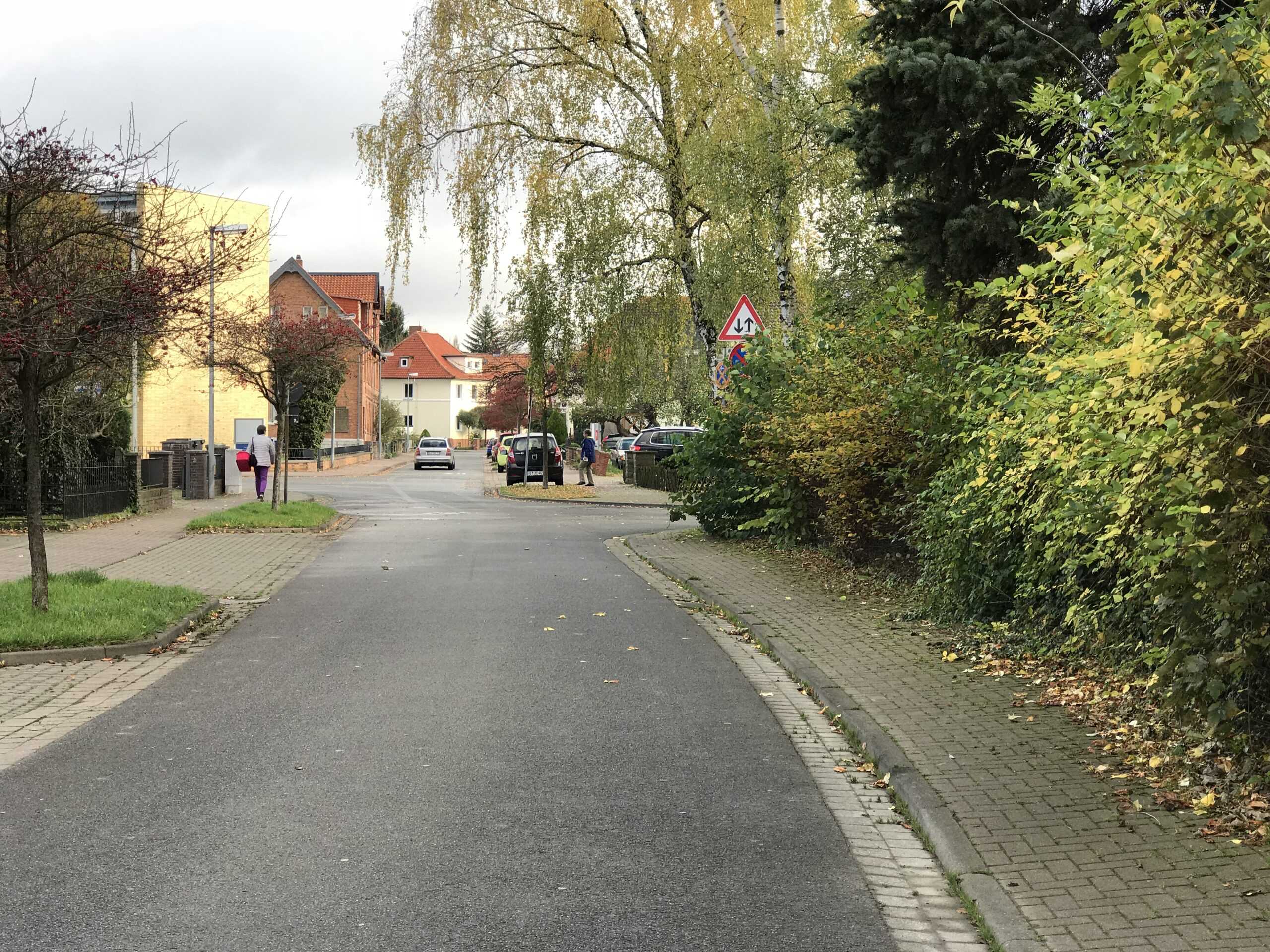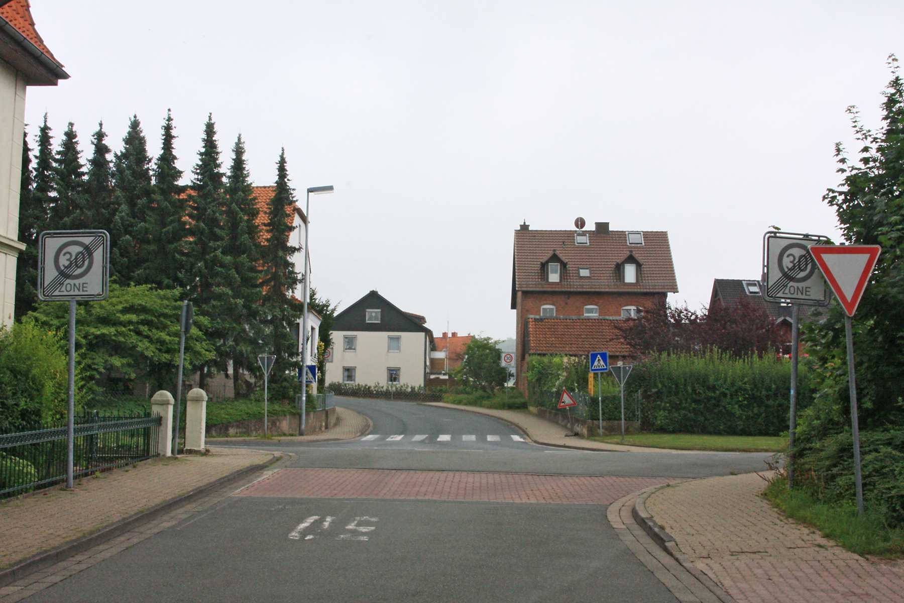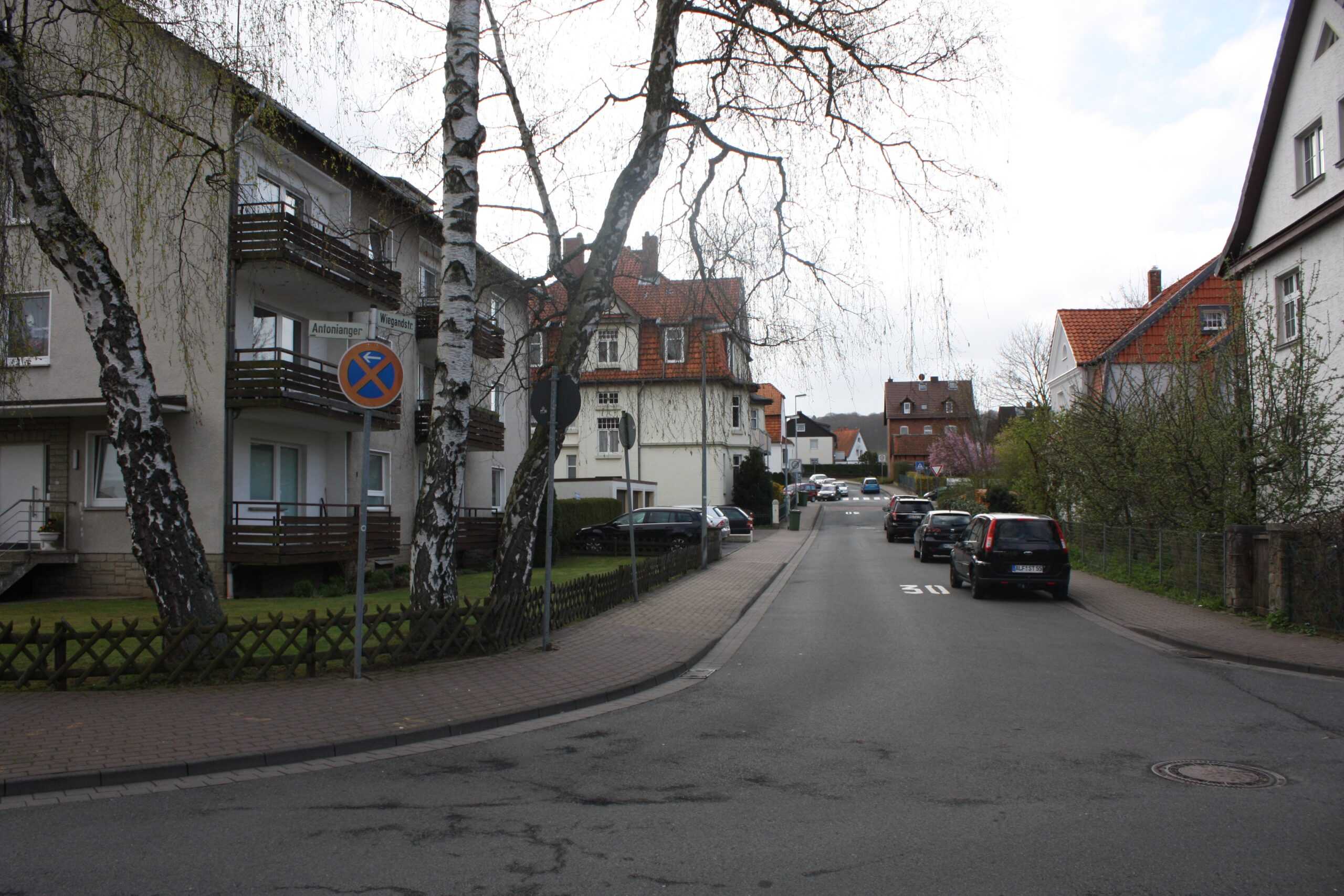 Diese Straße wurde einst nach der Kaufmannsfamilie Wiegand genannt. Sie war früher eine kleine, gemütliche Verbindungsstraße vom Antonianger zur Heinzestraße und Sindelberg, wie das nachfolgende Foto aus den 1960er Jahren zeigt. Das Haus, links im Bild, neigt sich seit Jahren aufgrund der schlechten Bodenbeschaffenheit unübersehbar kontinuierlich zur Seite. Somit ist das für Alfeld schon eine kleine Besonderheit.