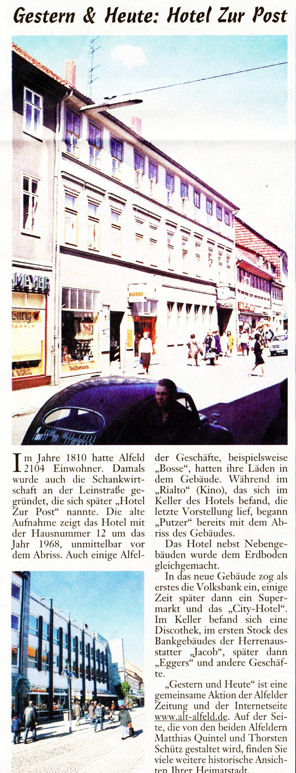 In der Ausgabe vom 03.03.2011, Hotel Zur Post, sind uns ein paar Fehler unterlaufen. Leider passen die Bilder nicht richtig zum Text. Das Hotel Zur Post ist im linken Bildrand leider nur ganz wenig zu sehen. Beim hier gezeigten Haus handelt es sich um das Steckhansche Haus das für den Bau der Volksbank abgerissen wurde, ferner befand sich das Kino nicht im Keller des Hotels. Im Keller war später die Disco.
